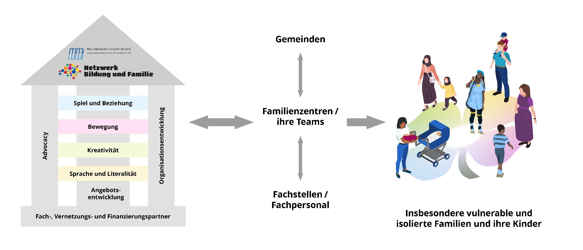 Mit dem innovativen Programm möchten wir erreichen, dass mehr Kinder und Eltern Zugang zu einem anregenden Umfeld finden. Speziell im Fokus stehen dabei vulnerable und isoliert lebende Familien mit jungen Kindern.